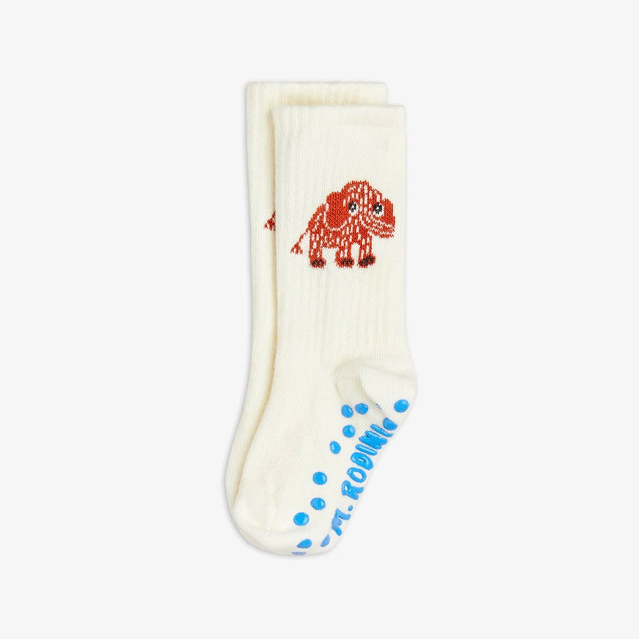 Anti-slip socks with an adorable mammoth print made from GOTS-certified organic cotton with stretch. Designed with reinforced heels and toe caps. Silicone bubbles are printed under each foot to prevent slipping.